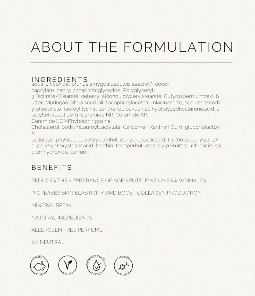 Our replenishing Anti-Aging Hand Cream combines the benefits of organic ingredients to deliver a powerfully regenerative solution that is scientifically formulated to repair, restore and expertly protect the body’s hardest working skin. The richly textured and delicately perfumed cream absorbs rapidly, improves skin elasticity, enhances collagen production, reduces the appearance of age spots as well as fine lines and wrinkles. Prevents hands from drying out and even provides SPF 20 protection.